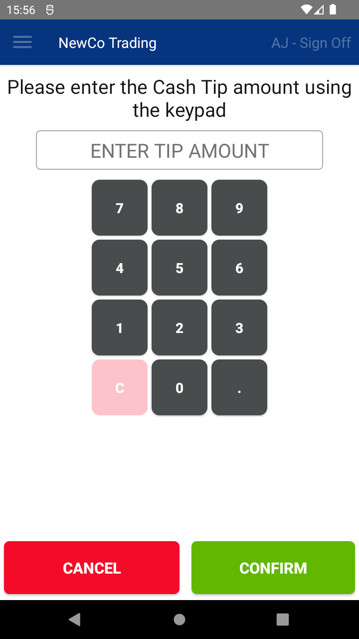 - Enter the tip amount using the keypad, then confirm.