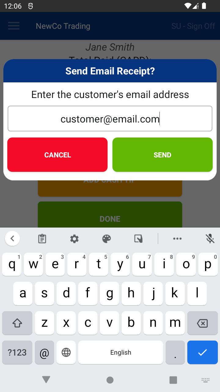- Tap SEND to email the receipt
