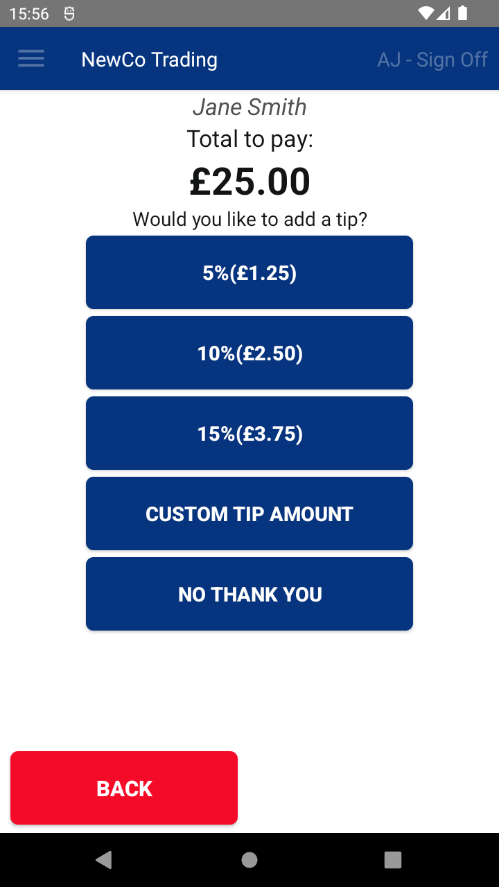 Depending on your configuration, you may be prompted to add a tip:- Tap a gratuity amount to include it,