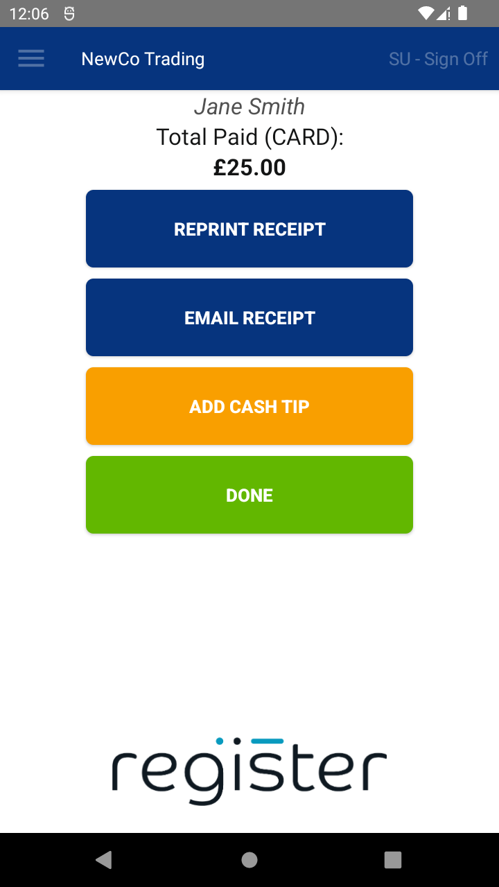If no action is taken, once the countdown reaches 0, the system will automatically select DONE and return you to the main screen, ready for the next transaction. This helps keep the device ready to use and avoids it being left on the summary screen.